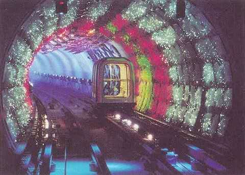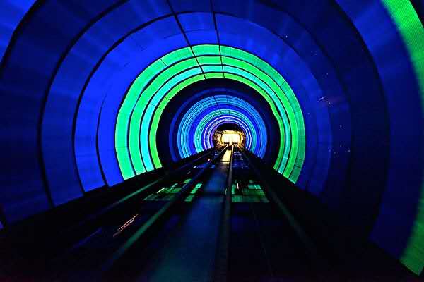 外灘觀光隧道通過聲、光、電、激光等高科技手段,在直徑僅6.76米、長646.7米的圓隧道內(nèi)制作五光十色的動態(tài)景觀。雖然過江時(shí)間只有5分鐘,但游客將經(jīng)過八個(gè)景色不同、內(nèi)涵各異的景區(qū)。首先經(jīng)過的是“時(shí)光隧道區(qū)”。