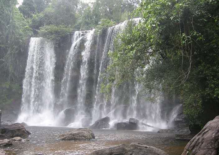 在波列昂通寺西南有一著名瀑布,叫荔枝山瀑布,位于暹粒河上游的一個開闊山谷,山谷左右有茂林修竹夾峙。水簾似的大瀑布沿石壁傾瀉而下,勢如萬馬奔騰。版權所有山東聊城聊之旅國際旅行社有限公司,轉(zhuǎn)載必究!瀑布分為兩節(jié),第一節(jié)約 25 米高,沿著石壁傾注在一塊約1000 平方米的平臺上。瀑水流過平臺,到了一垛落差約 30 米高的絕崖峭壁上部,從這里再沖出峭崖,砰然跌落,又形成寬達 100 米的瀑布,響聲雷鳴,水花四濺,景色極為壯觀。平臺上分布著 16 個深淺不同的天然石洞,洞底有一層薄薄的黃沙,游人可以在洞中用瀑水洗澡。