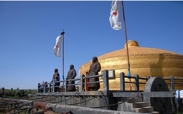 由入口門景往北展延的大道就是成吉思汗圣道和風(fēng)景道。我們就可以沿著吉祥的成吉思汗圣道和風(fēng)景道參觀各個景點,最后到陵宮,拜謁成吉思汗陵[2]。