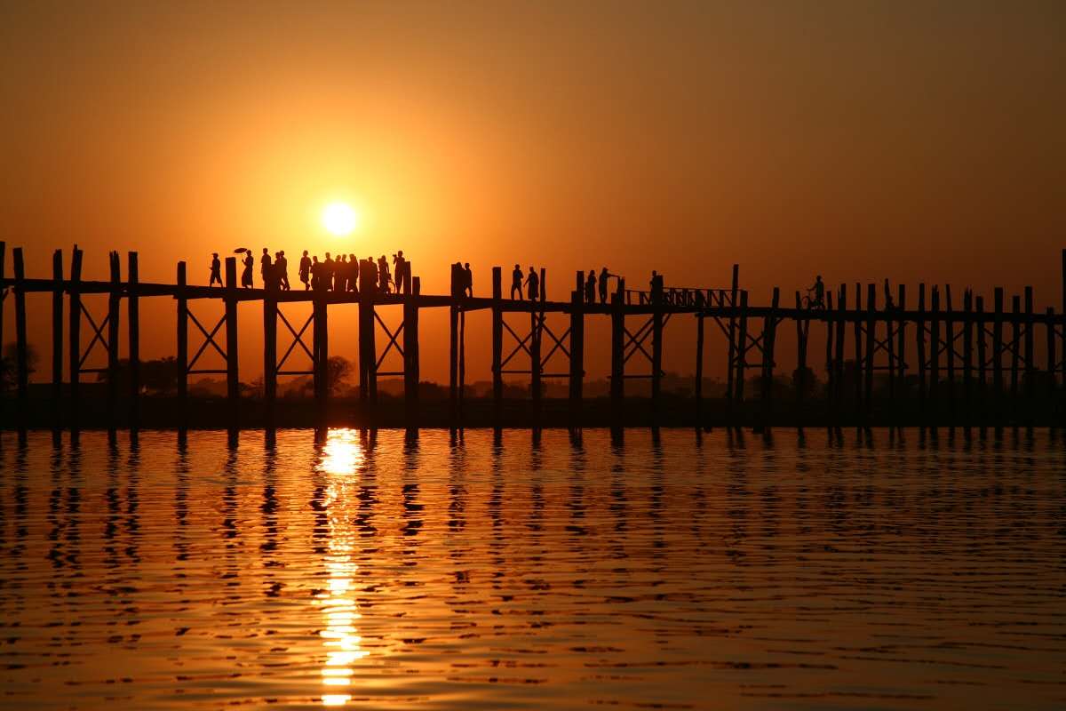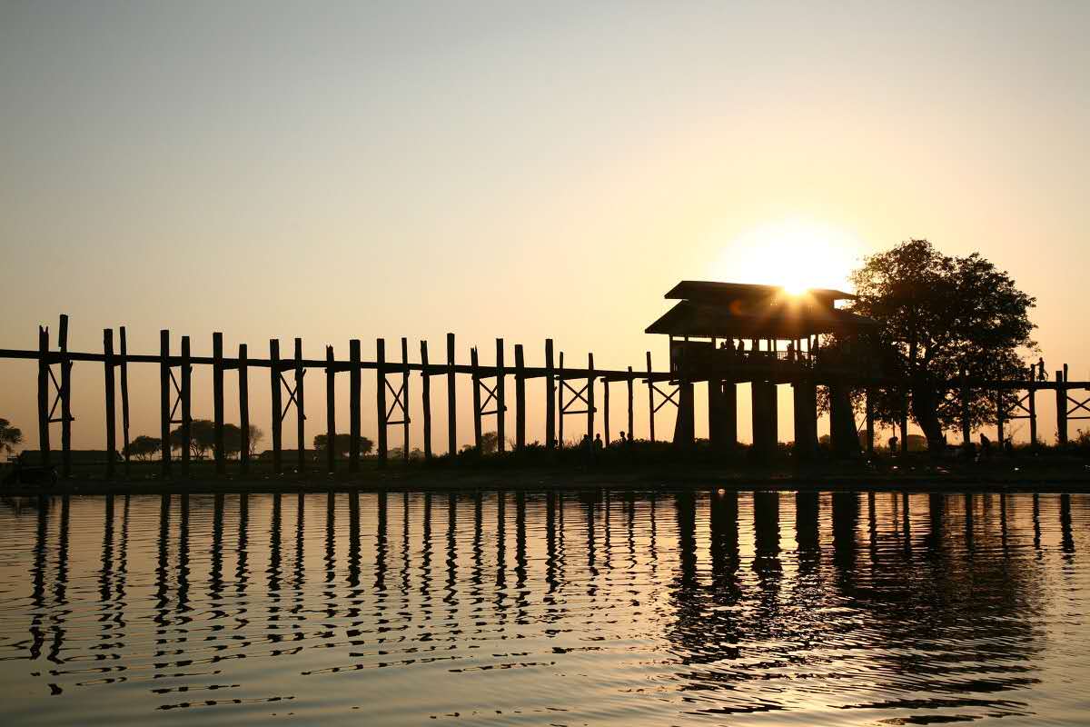 烏本橋建于1851年,長(zhǎng)1200米,全橋完全由柚木鉚合而成,是世界上最古老和最長(zhǎng)的柚木結(jié)構(gòu)橋。橋柱與橋柱之間相距3米遠(yuǎn),橋柱有1000多根。整座橋相接處沒有使用一顆鐵釘,全靠斗榫。這座橋已經(jīng)歷經(jīng)150年的風(fēng)風(fēng)雨雨,但是依然結(jié)實(shí)。