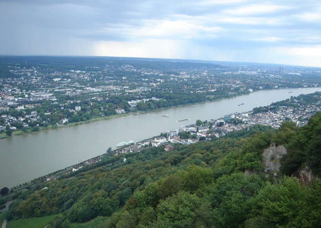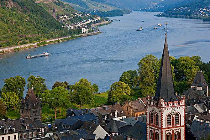 萊茵河中部是該河景色最為壯麗且最富有民間傳奇色彩的一段。在此長145公里的地段,萊茵河從西有洪斯呂克山脈(Hunsruck Mountains)、東有陶努斯山脈(Taunus Mountains)的險峻、板巖覆蓋的山坡之間流過,形成一段曲折而深邃的峽谷。遠(yuǎn)至科布倫茨(Koblenz),兩岸山坡上布滿葡萄園;在科布倫茨,有摩澤爾(Moselle)河和蘭(Lahn)河與萊茵河會合。往下,兩岸遠(yuǎn)處有丘陵起伏,西邊有火山艾費爾高原(Eifel Upland)的山麓丘陵,東邊有韋斯特林山(Wester Forest)的山麓丘陵。在安德納赫(Andernach),玄武巖的塞文高地(Seven Hills)突起于河的西邊。