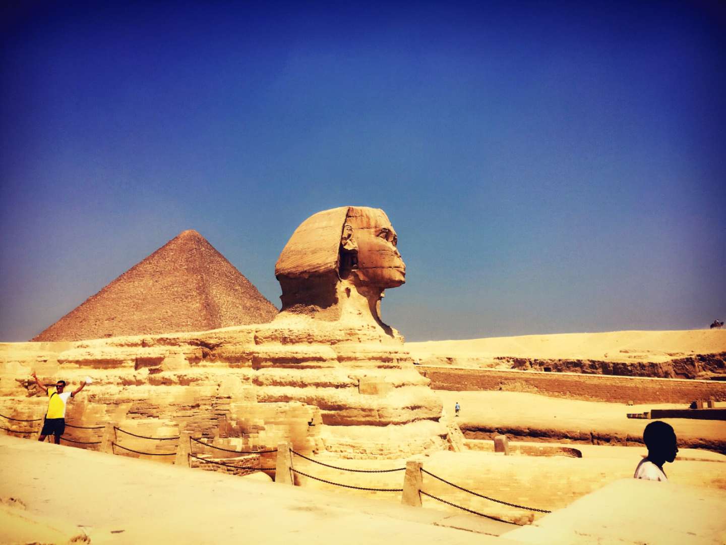 如果不說金字塔是世界奇觀,就不能說是到過了埃及。從開羅西行數(shù)公里,來到吉薩村前。在便屹立眼胡夫金字塔東側(cè),便是獅身人面像,它以誘人的魔力,吸引了各地的游客。“怪物”--斯芬克斯獅身人面像的頭像,真的是以胡夫作模特兒的嗎?不過比較可惜的是獅身人面像的鼻子被打破了,有損美觀及協(xié)調(diào)性。