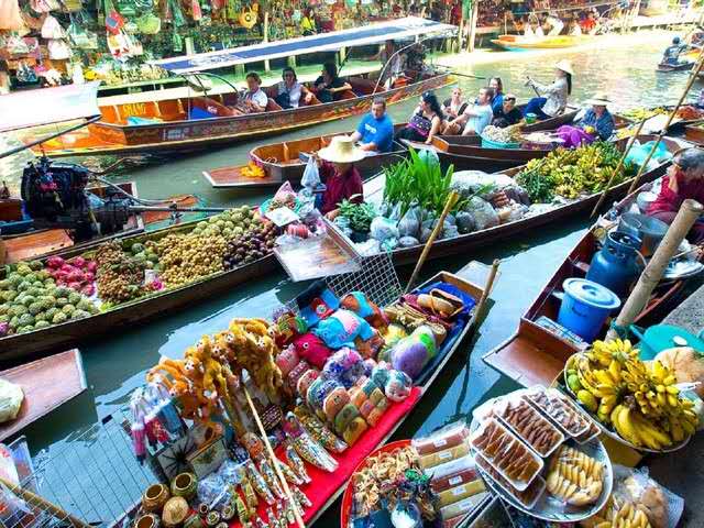 每天早上約7點(diǎn)到9點(diǎn),是當(dāng)?shù)厝私灰鬃铑l繁的時候,會有一艘接著一艘的小船從附近駛來,賣時蔬水果、干貨、小吃、鍋碗器皿、草帽等,在船上煮米粉、剖椰子都是輕而易舉的事情。店家各持一艘船,景象實在壯觀。約莫10點(diǎn)左右,除了小販的船外,更多了載觀光客的船,有時河道可能也會被擠得水泄不通,出現(xiàn)難得的「塞船」景象,不過這里有水上警察吹哨音指揮,紓解交通,很快就能讓河面再度活絡(luò)起來。