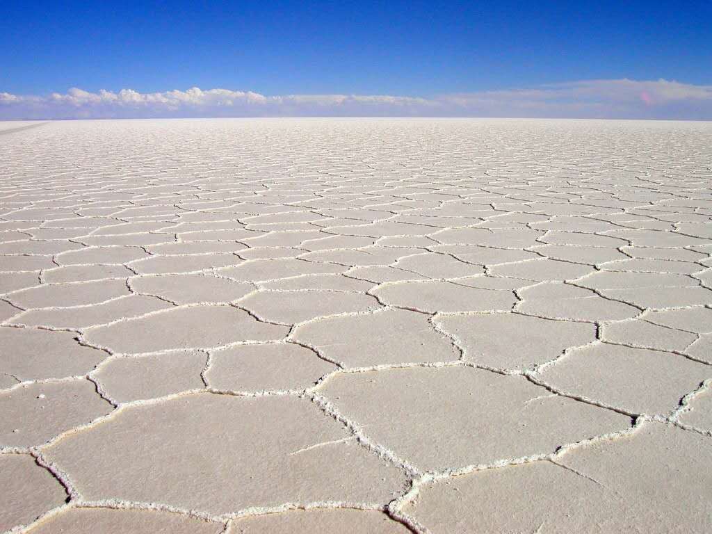 在高原南端有一些冰川融化時留下的鹽湖,而在1萬年前最后一個冰期(第四紀冰期)結(jié)束時,湖水已逐漸消失。高原上最大并最令人印象深刻的就是烏尤尼鹽沼(Salar de Uyuni)。每年夏季(雨季12月至次年1月),它被雨水注滿,形成一個淺湖;而每年冬季(旱季7月至10月),湖水則干涸,留下一層以鹽為主的礦物質(zhì)硬殼,中部達6米厚。人們可以駕車駛過湖面。尤其是在雨后,湖面像鏡子一樣,反射著好似不是地球上的、美麗的令人窒息的天空景色,這也就是傳說中的“天空之鏡”。由于面積空曠,極其光滑(覆蓋著淺水),同時又極平整(海拔差異極小),地表反射率極高,使阿塔卡瑪成為一個理想的測試和校準地球遙感衛(wèi)星之地。