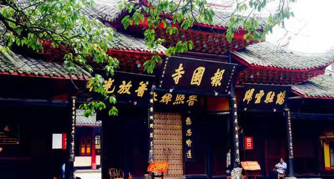 山門的“報(bào)國寺”大匾,是清康熙皇帝御題,王藩手書。正殿懸有“寶相莊嚴(yán)”匾。山門兩邊柱上那副對(duì)聯(lián)“鳳凰展翅朝金闕,鐘磬頻聞落玉階。”就是對(duì)報(bào)國寺這只“金鳳凰”周圍景物的生動(dòng)描寫。橫匾“普照禪林”和“普放光明”,同是一個(gè)意思:佛教稱峨眉山為“大光明山”,晝有神奇的佛光出現(xiàn),夜有萬盞圣燈來朝,全峨眉山都被光明普照。右邊“鶴駐云歸”,意為鶴停下了,云歸山岫,喻指清涼靜地,含有道家韻味。大門上的聯(lián)語:“獨(dú)思喻道,敷坐說經(jīng)。”前者是說靠自己的思維明白佛經(jīng)的道理,就是佛學(xué)講的“獨(dú)覺”境界。后句是說高僧大德鋪設(shè)好法座向弟子講經(jīng)說法。