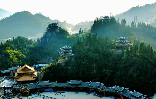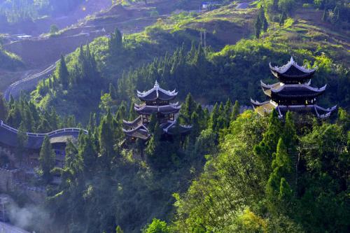 九黎宮:科學利用山水自然資源,因地制宜、依山造勢,順山而居。宮高99米,呈11開間,象征九九歸一之意。建筑由四合院到吊腳樓到?jīng)_天樓三合為一,九黎宮內有苗族接龍?zhí)谩駱腔⒖谔谩⑺暮显骸俗殖T和吊腳樓群等多種文化符號,是彭水展示苗族文化、民風民俗的博物館,是目前最大的吊腳樓群。