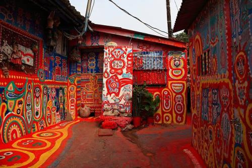 起源于住在臺(tái)中市南屯區(qū)嶺東科技大學(xué)附近有一處舊眷村的八十七歲老榮民黃永阜,因?yàn)椤笩o聊」而拿起畫筆彩將眷村內(nèi)的巷弄街道當(dāng)成了天然的畫布,在上頭彩繪了各式美麗的彩虹線條與可愛動(dòng)物,不僅染亮了小村,在網(wǎng)路上引起熱烈討論,更形成一股參訪風(fēng)潮。黃永阜先生86歲時(shí)開始作畫,他用自己手中的畫筆在眷村老舊的房屋和街道上勾勒出一個(gè)色彩斑斕的童話世界。老人最初只是在自家的屋里屋外用畫筆描繪心事,打發(fā)時(shí)光。后來不少鄰居被他充滿童真的畫所吸引,也邀請(qǐng)他去作畫,就這樣老人在無意中創(chuàng)造了一段色彩繽紛的傳奇。如今,他所居住的位于臺(tái)中市春安里的眷村被人們賦予了一個(gè)好聽的名字:“彩虹眷村”,并成為了當(dāng)?shù)氐臒衢T景點(diǎn),每年吸引約50萬人前來參觀,而香港籍退伍老兵黃永阜則被人們親切地稱為“彩虹爺爺”。走進(jìn)“彩虹眷村”,地面上、墻壁上畫滿了色彩艷麗、造型俏皮的兔子、小雞、猴子、小鳥、卡通人物、花朵、太陽(yáng)以及彩虹等。紅色、黃色、藍(lán)色、綠色、白色,絢爛的色彩和極富想象力的線條,讓人們馬上置身于童話世界中。村口那條數(shù)十米長(zhǎng)的巷道是“彩虹爺爺”作畫最多的地方,也是最熱鬧的地方。這里的畫色調(diào)明艷、熱烈,地上用油漆涂成了紅底,上面用白色和黃色等勾勒出小鳥、小雞和兔子等造型;墻上則分區(qū)塊時(shí)而以藍(lán)色為背景、時(shí)而以白色或黃色為背景,上面畫了數(shù)百卡通造型的猴子、貓和孩童。