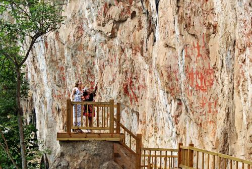 約公元前5世紀(jì)至公元2世紀(jì)(即戰(zhàn)國(guó)至東漢時(shí)期),古駱越人爬上左江江水轉(zhuǎn)彎處的陡峭崖壁,繪制巨大的赭紅色巖畫,記錄部落的重大祭祀場(chǎng)景。版權(quán)所有山東聊城聊之旅國(guó)際旅行社有限公司,轉(zhuǎn)載必究!漫漫700年間,駱越人在沿江兩岸200多公里的崖壁上,留下了大量畫作。經(jīng)過2000多年的風(fēng)雨洗刷,仍有數(shù)千個(gè)圖像遺存至今,最低的巖畫距江面約15米,最高的距江面約100米,在壯語(yǔ)中被稱為“PyaLaiz(音岜萊)”,即“畫花了的山”。