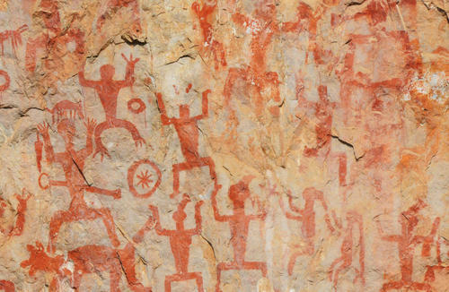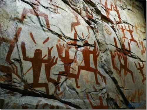 中國(guó)戰(zhàn)國(guó)至東漢繪制在崖壁上的圖畫。在廣西壯族自治區(qū)寧明縣東南14.5公里花山屯北明江東岸(見圖)。花山,壯語(yǔ)名為“岜來”,漢譯為“有畫的石山”。宋、明時(shí)代已有記錄。50年代初期調(diào)查發(fā)現(xiàn)。1988年中華人民共和國(guó)國(guó)務(wù)院公布為全國(guó)重點(diǎn)文物保護(hù)單位。 畫面臨江,崖壁明顯內(nèi)斜。畫面長(zhǎng)約 172米,距江面最高約90余米,底部高出江面30米,距離山腳一級(jí)階地 3~10米不等。繪畫顏料是赭紅色的赤鐵礦粉,用動(dòng)物脂肪稀釋調(diào)勻,用草把或鳥羽直接刷繪在天然崖壁上。畫法采用單一色塊平涂法,只表現(xiàn)所畫對(duì)象的外部輪廓,沒有細(xì)部描繪。風(fēng)格古樸,筆調(diào)粗獷,場(chǎng)面十分壯觀。現(xiàn)存圖像1900多個(gè),包括人物、動(dòng)物和器物 3類,以人物為主。人物只畫出頭、頸、軀體和四肢,無五官等細(xì)部。基本造型分正身和側(cè)身兩種。正身人像形體高大,最大的高達(dá) 2米以上,皆雙臂向兩側(cè)平伸,曲肘上舉,雙腿叉開,屈膝半蹲,腰間橫佩長(zhǎng)刀或長(zhǎng)劍。側(cè)身人像數(shù)量眾多,形體較小,多為雙臂自胸前伸出上舉,雙腿前邁,面向一側(cè),作跳躍狀。