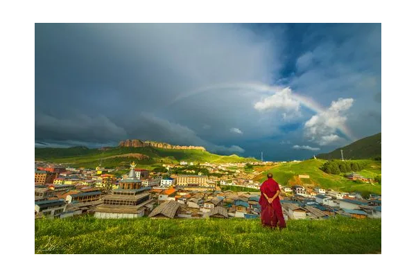 郎木寺在攝影家的鏡頭前有一個(gè)標(biāo)志性的焦點(diǎn)一一紅石崖,郎木寺的回、漢百姓稱(chēng)其為“紅山”。這里是郎木寺太陽(yáng)每天升起的地方,藏語(yǔ)稱(chēng)其為“瓊波瑪”(???????????),意為供品山,因其形狀似擱置供品的托盤(pán)而得名。此山也酷似一頂皇冠,也是所說(shuō)的“皇冠似的紅山崖”。