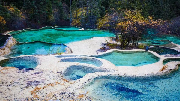 黃龍溝因流水中鈣化沉淀堆積,形成了3400余個鈣化彩池,8萬平方米的鈣化流灘,5個巖溶瀑布,4個溶洞。在黃龍五彩池長3.5公里,寬1~2公里的黃龍溝內,面對玉翠山,四周原始森林密布,鈣化翠池、金色流灘,似一條黃色巨龍俯臥于密林之中。池水清澈透明,在日光照射下,五彩繽紛。人行其間,似入畫中,被譽為“人間瑤池”。