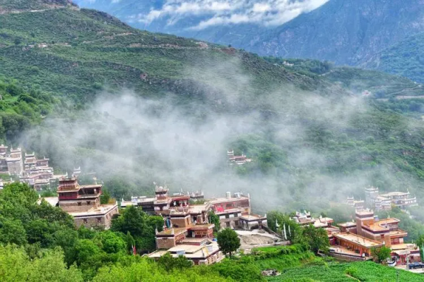 “甲居”,藏語是百戶人家之意。藏寨從大金河谷層層向上攀緣,一直伸延到卡帕瑪群峰腳下,整個(gè)山寨依著起伏的山勢迤邐連綿,在相對高差近千米的山坡上,一幢幢藏式樓房灑落在綠樹叢中。或星羅棋布,或稠密集中,或在高山懸崖上,或在河壩綠茵間,不時(shí)炊煙裊裊、煙云繚繞,與充滿靈氣的山谷、清澈的溪流、皚皚的雪峰一起,將田園牧歌式的畫卷展示在人們眼前,以一種藝術(shù)品的形態(tài)存在。2005年由《中國國家地理》雜志組織的選美中國活動(dòng)中,以甲居藏寨為代表的“丹巴藏寨”被評為“中國最美的六大鄉(xiāng)村古鎮(zhèn)”之首。