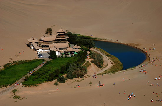 鳴沙山位距敦煌市南郊5公里,因沙動成響而得名。山為流沙積成,分紅、黃、綠、白、黑五色。漢稱沙角山,又名神沙山,魏晉時始稱鳴沙山。其山東西綿亙40余公里,南北寬約20余公里,沙壟相銜,盤桓回環(huán)。其特點:“峰巒陡峭,山脊如刃;馬踐人馳,殷殷有聲;輕若絲竹,重如雷鳴;沙隨足落,經(jīng)宿復(fù)初。”
