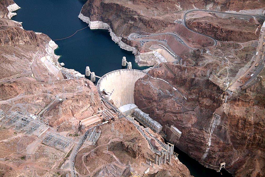 胡佛水壩(Hoover Dam)是美國綜合開發(fā)科羅拉多河(Colorado)水資源的一項(xiàng)關(guān)鍵性工程,位于內(nèi)華達(dá)州和亞利桑那州交界之處的黑峽(Black Canyon),具有防洪、灌溉、發(fā)電、航運(yùn)、供水等綜合效益。 大壩系混凝土重力拱壩,壩高221.4m,大壩形成的水庫叫米德(Mead)湖,總庫容348.5億立方米,水電站裝機(jī)容量原為134萬kW,現(xiàn)已擴(kuò)容到208萬kW,計(jì)劃達(dá)到245.2萬kW。于1931年4月開始動(dòng)工興建,1936年3月建成,1936年10月第一臺(tái)機(jī)組正式發(fā)電。