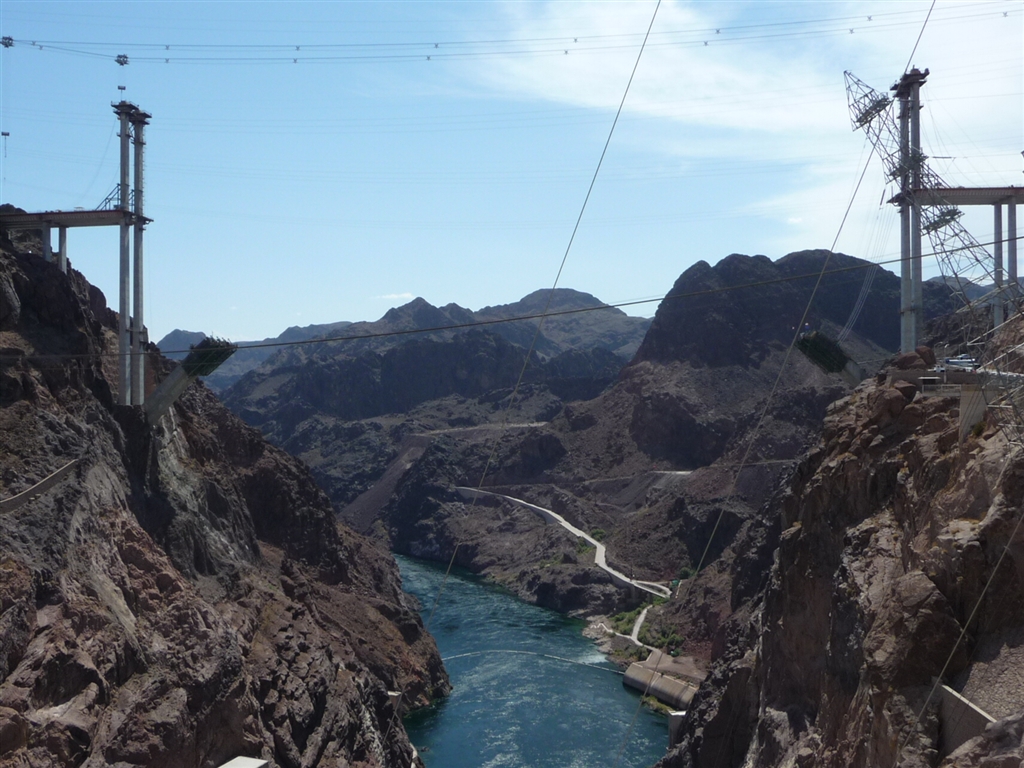 胡佛水壩--俯視胡佛水壩(Hoover Dam)位于亞利桑那州的西北部,93號(hào)洲際高速公路上,內(nèi)華達(dá)州及亞利桑那州的西北部交界處,從拉斯維加斯出發(fā)向東南方向行駛約40公里處。工程龐大,建成后對(duì)工農(nóng)業(yè)發(fā)展起著巨大的作用。因此它在世界水利工程行列中占有重要的地位。胡佛水壩的建造耗費(fèi)了大量資金,動(dòng)員了大批人力,于1936年竣工并交付使用。它是一座拱門式重力人造混凝土水壩。壩高220米,底寬200米,頂寬14米,堤長(zhǎng)377米。這樣巨大的水壩在世界上是不多見的,它宛如一條巨龍盤臥在大地上,顯得十分威武。