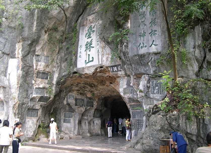 風(fēng)洞之南,即前洞,是疊彩洞,因山得名,古稱疊彩巖。高3.65米,寬5.6米,長(zhǎng)12.5米。面積約70平方米。洞口有陳毅名句"愿作桂林人,不愿作神仙"的題刻,以及壁有佛像90余尊,為唐宋物,故又名福庭洞。