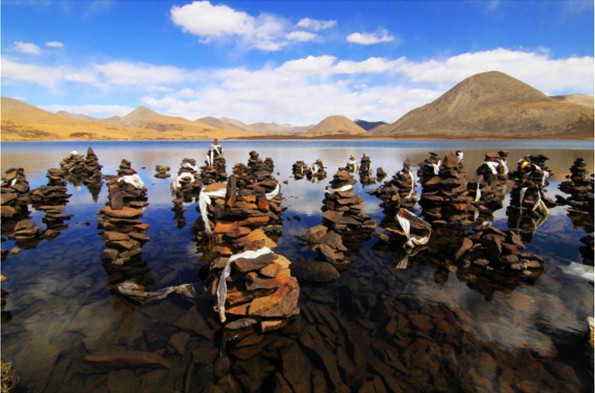 據(jù)藏文古籍《五部遺教》等藏文記錄,墨竹思金拉措神湖位于猶如聚寶盤里用金銀財寶向四周供奉曼陀羅。其間,藍天倒映在湖中。而墨竹思金龍王以雪域財主的身份把財寶撒在大地上,撒滿整個雪域山川,并用各種珍貴藥材及樹木、鮮花、野生動物將其點綴,。神湖后面形如龜王的山上有蓮花生大師修行的“仲巴”巖洞及許多歷史悠久的修禪靜地和生成之物。