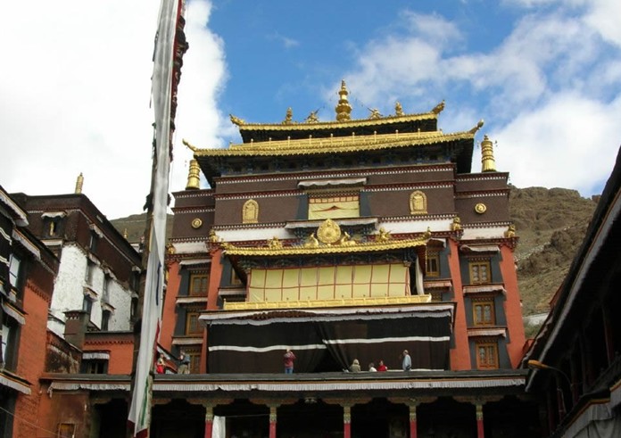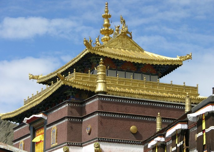 度母殿位于寺院經(jīng)堂后面三座佛殿東側(cè),三座佛殿中居中的是釋迦牟尼殿,西側(cè)是彌勒殿;釋迦殿內(nèi)供5米多高的釋迦牟 尼鎏金銅像,據(jù)說像體內(nèi)有釋迦舍利,還有宗咯巴的頭發(fā)以及根珠巴的經(jīng)師西繞森格的頭蓋骨。度母殿藏語稱卓瑪康,供2米高的白度母銅像,兩旁還有泥塑的綠度母像。
