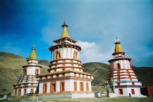 覺囊寺坐落在日喀則拉孜縣歐布瓊山山腰處,海拔4600米。始建于公元十二世紀,由貢巴•土杰尊珠主持修建。該寺曾有二萬多名僧人,在歐布瓊山上有二千多處修行洞和坐禪房,并修建了一座“萬佛一見得解塔”,塔高約27米,塔型呈“時輪壇城”,有108個門、108個殿堂。主供佛為喜繞堅贊師徒三尊佛。每年藏歷4月15日,該寺舉行“時轉(zhuǎn)跳神”活動。
