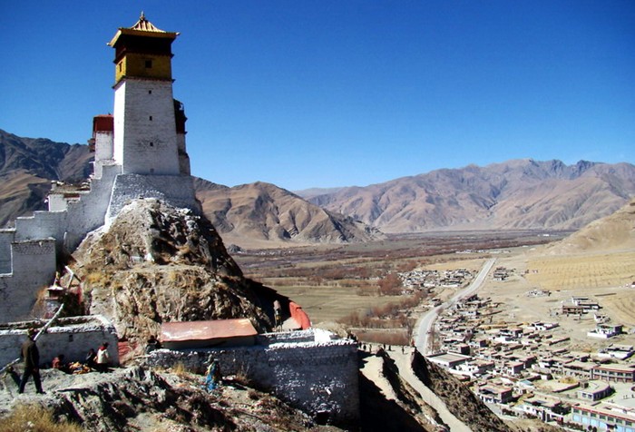 雍布拉康,藏語(yǔ)意為“母子宮”,是西藏歷史上第一座宮殿,也是西藏最早的建筑之一,位于山南地區(qū)澤當(dāng)鎮(zhèn)東南,高聳于雅礱河?xùn)|岸扎西次日山頂。相傳是苯教徒于公元前2世紀(jì)為第一代藏王聶赤贊普建造,后來成為松贊干布和文成公主在山南的夏宮,五世達(dá)賴時(shí)改為黃教寺院。 雍布拉康主要供奉釋迦牟尼佛像。宮殿內(nèi)的壁畫上生動(dòng)地描繪了西藏的第一位國(guó)王,第一座建筑,第一塊耕地的歷史故事。 雍布拉康分為兩部分,前部是一幢多層建筑,后部是一座方形高層碉堡望樓,與前部相連。公元5世紀(jì),藏王托托念贊時(shí)期,傳說一本佛經(jīng)從天而降,正好跌在雍布拉康宮頂,當(dāng)時(shí)無人能識(shí)。有圣人斷言,到了公元7-8世紀(jì)就有人能解讀此書。所以這本書被很好地保留在雍布拉康。