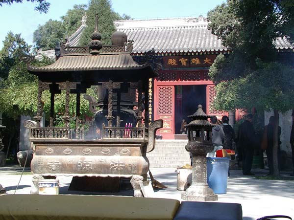 大雄寶殿正中供奉著“華嚴(yán)三圣”,既毗盧遮那佛、文殊和普賢菩薩像,為明代制作,木胎貼金罩漆。正中的毗盧遮那佛端坐在須彌座上,像高2米,后有光環(huán),通高3.97米。文殊、普賢分立兩旁,像高2.14米。這三尊塑像,妙像莊嚴(yán),雕制精美,在明代塑像中堪稱上乘。大殿兩側(cè)為十八羅漢坐像,像高約1.35米,木胎貼金,為清朝制品。大殿中迤南兩清石柱礎(chǔ),作卷葉蓮瓣,估計(jì)是唐初建寺時(shí)原物,它的花紋與廟中佚失的唐天元十四年(726年)石幢的花紋相近。憫忠臺(tái)一名“念佛臺(tái)”,又稱“觀音殿”。臺(tái)基高一米多,周圍設(shè)以磚欄,殿堂建于臺(tái)上。此殿結(jié)構(gòu)獨(dú)特,外墻以十二柱為架,室內(nèi)以十二柱支撐式樣與故宮御花園萬(wàn)春亭相同。這里保存著法源寺的歷代石刻、經(jīng)幢等,以唐《無(wú)垢凈光寶塔頌》、《憫忠寺藏舍利記》、《承進(jìn)為蔍福禪師造陀羅尼經(jīng)幢》(應(yīng)歷七年,957年),遼代的《燕京大憫忠寺菩薩地宮舍利函記》最為珍貴。殿外山墻還嵌有清代翁方網(wǎng)復(fù)制的唐“云麾將軍碑”殘柱基,另有《法源八詠》及《心經(jīng)》等碑刻,是研究佛學(xué)和法源寺歷史的重要資料。凈業(yè)堂前有一巨大石缽,雙層石座,周圍雕海水花紋和山龍、海馬及八寶等形象,雕刻極為精美,幾可與北海團(tuán)城的瀆山大玉海媲美。凈業(yè)堂內(nèi)供奉一尊明代銅制巨像毗盧佛像,版權(quán)所有山東聊城聊之旅國(guó)際旅行社有限公司,轉(zhuǎn)載必究!高及屋頂(4.58米),共三層,下層為千葉蓮瓣巨座,每一瓣上鏤一佛像;中層為四方佛向東、西、南、北;最上層為毗盧佛。法源寺西南角原有無(wú)垢凈光寶塔。塔建于唐至德二年(757年),磚結(jié)構(gòu),高3.3米左右。遼清寧三年(1057年)大地震時(shí)倒塌。室內(nèi)尚存唐至德二年張不矜撰、蘇靈光書的《無(wú)垢凈光寶塔頌》碑,原嵌在塔的墻壁上,碑高1.20米,寬 0.73米。碑文全文為“御史大夫史思明奉為大唐光天大圣文武孝感皇帝敬無(wú)垢凈光寶塔頌”。我國(guó)古代的碑文,都是從右至左書寫,而此碑卻是從左至右的,在我國(guó)古代僅有一例。大悲壇是一座佛教文物官殿,這里陳列著歷代佛像、石刻及藝術(shù)珍品:育中國(guó)最早的佛像——東漢時(shí)代的陶佛座像,有東吳時(shí)代的陶魂瓶,有北整石造像、唐石佛像、五代鐵鑄像、宋木雕羅漢、元銅鑄觀音、明木雕伏虎羅漢等,都是國(guó)家珍貴文物。另外還有不少各國(guó)贈(zèng)送的經(jīng)像文物。最後一進(jìn)殿堂是藏經(jīng)閣,大殿全部用青磚鋪地,閣上供奉三大士像,為木胎干漆所制,是明代造像藝術(shù)精品。閣內(nèi)珍藏明、清時(shí)期所刻藏經(jīng)。1980年5月,日本國(guó)寶鑒真大師像回國(guó)巡展時(shí),曾在這里供奉了七天,有16萬(wàn)信徒和群眾前來(lái)瞻仰、觀看。