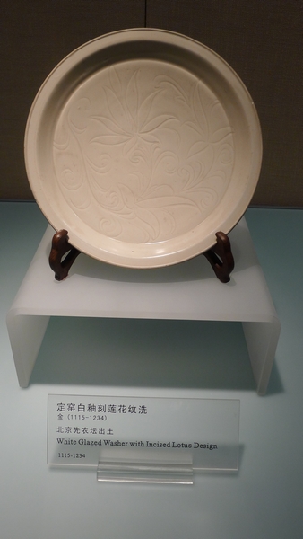 瓷器展廳中展出了北京作為都城歷史時期出土和傳世的瓷器170組件,青花釉里紅海水云龍紋天球瓶在2000年就已價值1000萬元。另外宋遼金時期的定窯白釉童子誦經(jīng)壺、元大都出土的青花鳳首扁壺、乾隆松石綠地粉彩蕃蓮紋多穆壺等名貴瓷器都是難得一見的稀世精品。展廳中還列有明成化斗彩葡萄紋杯,這對葡萄紋杯與雞缸杯為同時期作品,都是明代官窯的代表作,而雞缸杯只有一只,葡萄紋杯是一對,這對杯子是在清初重臣索尼7歲孫女的墓中出土的。
