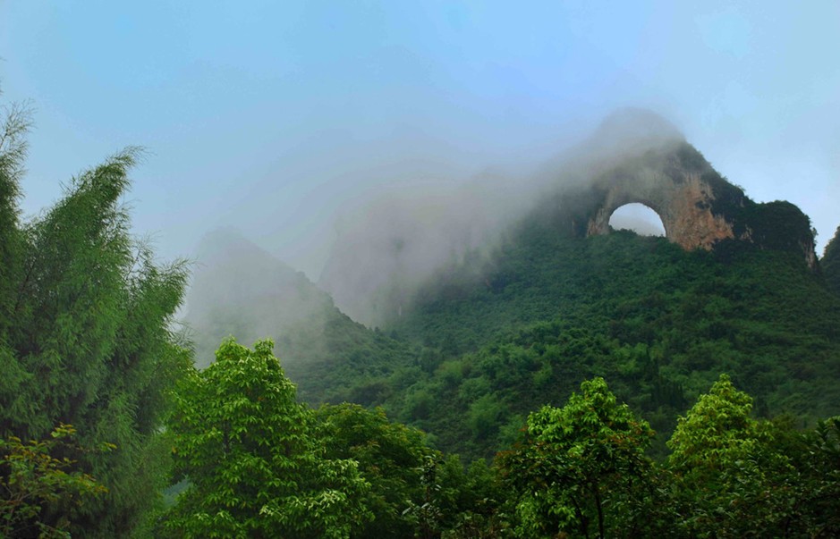 月亮山位于位于廣西壯族自治區(qū)桂林市陽朔縣十里畫廊景區(qū)末端。這里的風(fēng)光古樸素雅、恬靜安逸。山頭上有一個天然的大石拱,兩面貫通,遠(yuǎn)看酷似天上明月高掛。從不同的角度變換觀看,此洞形狀也不斷變化。