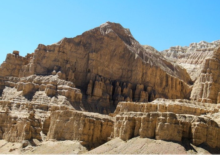 扎達土林面積達數(shù)百公里之闊,其地貌在地質(zhì)學(xué)上稱河湖相。專家考證,一百多萬年前,扎達到普蘭之間是個方圓500多公里的大湖,喜馬拉雅造山運動使湖盆升高,水位線遞減,逐漸沖磨出“建筑物”惟妙惟肖的形狀與層高,數(shù)十萬年風(fēng)雨的侵蝕,猶如神工鬼斧不間斷的雕琢打磨,更使他玲瓏剔透出神入化。