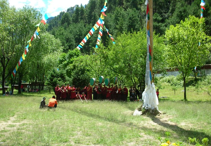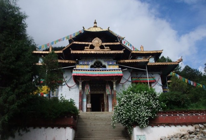 喇嘛嶺寺位于西藏林芝地區(qū)所在地八一鎮(zhèn)東南三十公里處的森林包圍的山坳里。喇嘛嶺寺的金頂與翠綠的松柏交相輝映。寺院經(jīng)堂和僧舍四周,各種顏色的菊花、格桑花爭(zhēng)相斗艷,鐃跋聲、鈴鼓聲以及渾厚而又清脆的誦經(jīng)聲回蕩在山谷。這座建于上個(gè)世紀(jì)三十年代末的古剎,屬藏傳佛教四大教派之一的寧瑪派(俗稱紅教)寺廟。