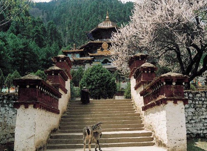 喇嘛嶺寺位于西藏林芝地區(qū)所在地八一鎮(zhèn)東南三十公里處的森林包圍的山坳里。喇嘛嶺寺的金頂與翠綠的松柏交相輝映。寺院經(jīng)堂和僧舍四周,各種顏色的菊花、格桑花爭(zhēng)相斗艷,鐃跋聲、鈴鼓聲以及渾厚而又清脆的誦經(jīng)聲回蕩在山谷。寺廟喇嘛從小“收養(yǎng)”的兩只灰色盤(pán)羊,脖頸戴著小鈴鐺,在寺院草壩上覓食。這座建于上個(gè)世紀(jì)三十年代末的古剎,屬藏傳佛教四大教派之一的寧瑪派(俗稱紅教)寺廟。