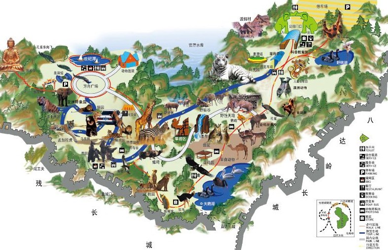 八達(dá)嶺野生動物世界設(shè)計(jì)建有30處景區(qū)及一個(gè)小型水庫,其中包括動物游覽區(qū)20處;古跡游覽區(qū)2處;表演場(館)4處;植物觀賞區(qū)1處;健身運(yùn)動區(qū)2處。園內(nèi)動物規(guī)模有47種達(dá)兩千余只(頭)。