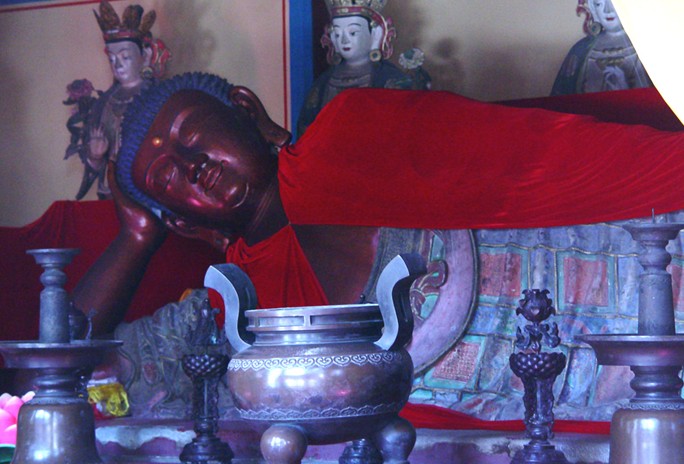 北京西山臥佛寺(Wofo Temple) 由于寺內(nèi)有一尊巨大的釋迦牟尼銅像、臥佛寺由此而得名。臥佛身長5.2米,用銅25000公斤 、鑄佛用工7000人。銅佛作睡臥式,頭西面南側(cè)身躺在一座榻上,左手平放在腿上,右手彎曲托首頭部。據(jù)說這是釋迦牟尼的紀念像。旁邊站著12尊小佛像,是他的12個弟子。他們的面部表情沉重悲哀,構(gòu)成一幅釋迦牟尼向12弟子囑咐后事的景像。殿的正面墻上掛一塊"得大自在”的橫匾,意思是得到人生真義也就得到最大自由。殿門上方亦有橫匾,書有"性月恒明”,意為佛性如月亮,明亮興輝永照。