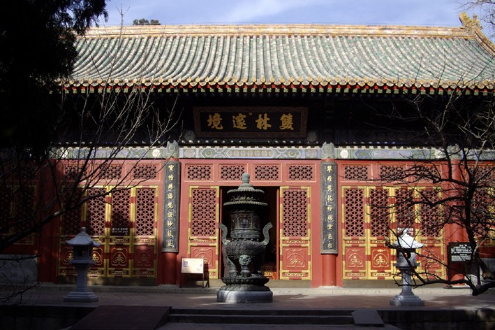 眼前忽一亮,一座四柱七樓的彩色琉璃牌坊無比輝煌。牌坊匾額為乾隆御筆親題“同參密藏”,背面為“具足精嚴”。過了牌坊便是山門,正中門額上懸著“十方普覺寺”,原有雍正御筆,現(xiàn)為趙樸初補題。庭內(nèi)有半圓形月池,也稱放生池。池上有石橋一座,橋柱的漢白玉雕刻,十分精美。月池左右為鐘鼓樓。山門后面是天王殿。