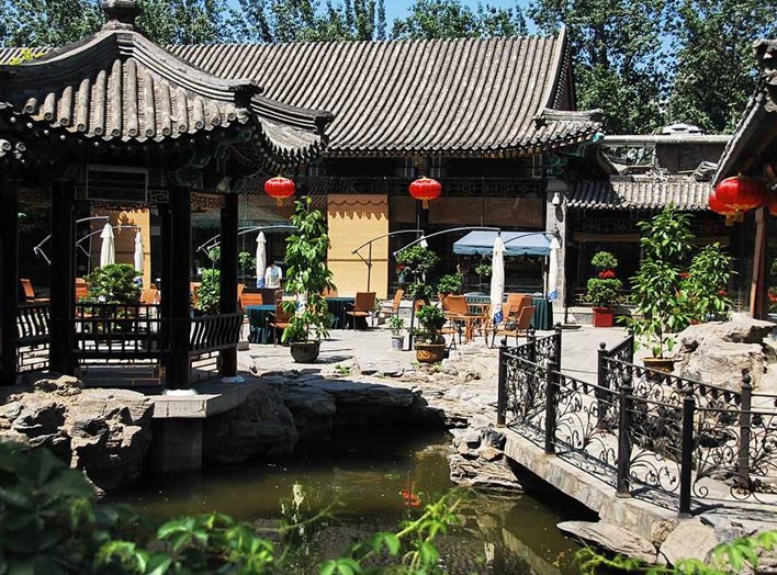 融合了江南庭院的湖光山色和古樸典雅的北方園林風(fēng)光。景區(qū)有近4700平方米的湖面。湖畔倚建古色古香的水榭、畫舫、小園亭,湖南北架以曲橋、拱橋。