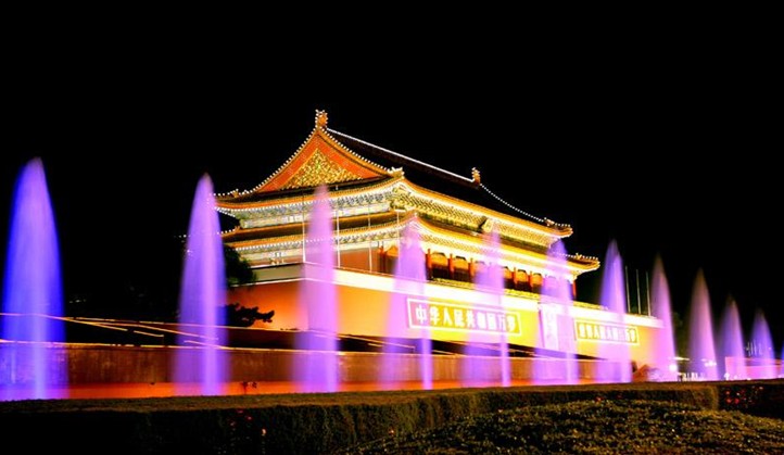 天安門(mén)位于北京城的傳統(tǒng)的中軸線上。由城臺(tái)和城樓兩部分組成,有漢白玉石的須彌座,總高34.7米。城樓上60根朱紅色通天圓柱,地面金磚鋪成,一平如砥;高大而色彩濃郁的墻臺(tái),上有兩層重檐樓,有黃色琉璃瓦,東西九間,南北五間,象征皇權(quán)的“九五之尊”。南北兩面均為菱花格扇門(mén),36扇朱紅菱花門(mén)扉;天花、門(mén)拱、梁枋上雕繪著傳統(tǒng)的金龍彩繪和吉祥圖案;貼金的“雙龍合璽”彩錦,版權(quán)所有山東聊城聊之旅國(guó)際旅行社有限公司,轉(zhuǎn)載必究!團(tuán)龍圖案的天花藻井,使整個(gè)大殿莊嚴(yán)雄偉,金碧輝煌。殿內(nèi)由一個(gè)450公斤八角宮燈和16個(gè)各重350公斤的六角宮燈組成的眾星捧月圖案。