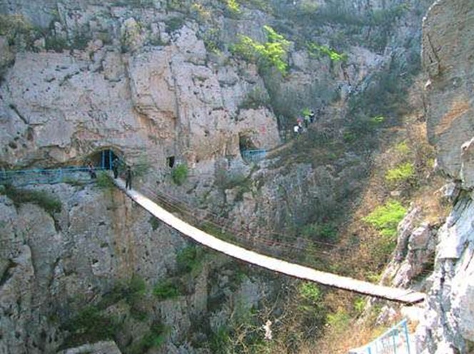 佛爺洞與七星洞有一峽谷相隔,景區(qū)開發(fā)者便凌空架起一道35米開的鐵索橋,把天塹變?yōu)橥ㄍ臼箖啥聪噙B,人踏鐵索橋一步九顫蕩悠悠,頓生“大渡橋橫鐵索寒”之感。不過,這里的鐵索橋絕對安全,被人譽為“冀南一絕有驚無險”是游人獵奇探險鍛煉意志和膽量的絕佳場所。