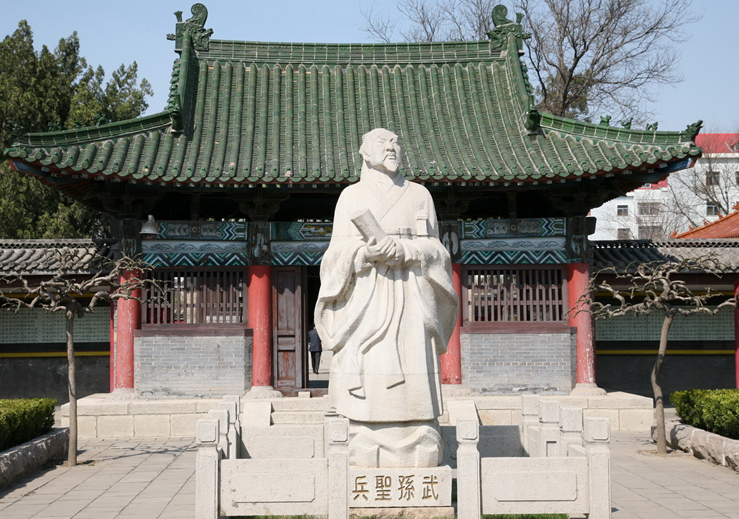 孫武祠位于廣饒縣城西北隅,占地面積8萬(wàn)平方米,與廣饒關(guān)帝廟大殿毗連,由4個(gè)相互通連的仿宋式建筑組成。院內(nèi)有一壁刻,書(shū)有確認(rèn)孫武故里—齊國(guó)樂(lè)安就是現(xiàn)在廣饒的《史記》、《資治通鑒》等史書(shū)文獻(xiàn)的記載和若干考證。院正中是高3米,一手拿竹簡(jiǎn),一手持寶劍的孫武的石雕像,正殿內(nèi)有孫武伏案疾書(shū)的銅像,身后是展現(xiàn)《孫子兵法》精彩場(chǎng)景的大型壁畫(huà)。