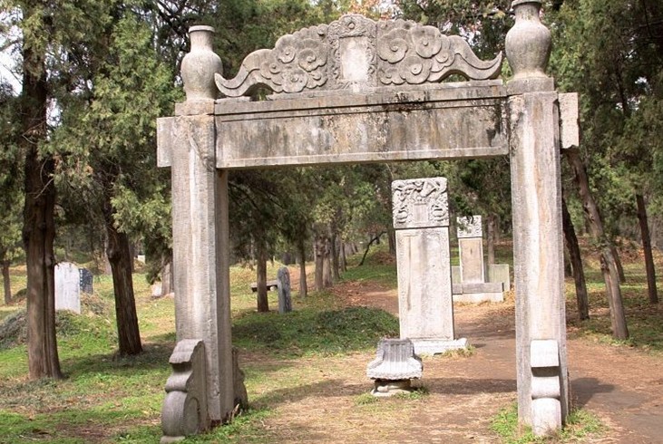 孔子墓前東側(cè)有三亭,是宋真宗、清圣祖和清高宗來此祭孔時停留之處,叫作“駐蹕亭”。 墓南二百米處的亭殿后,有子貢親手栽植的楷樹遺跡和“子貢廬墓處”。 孔林中除孔子墓外,氣派較大、墓飾規(guī)格也高的,要數(shù)第七十二代孫孔憲培妻子的墓——于氏坊。這位于氏夫人原來是乾隆皇帝的女兒,因當時滿漢不通婚,皇帝便將女兒過繼給一品大臣于敏中,又以子女名義下嫁給衍圣公,故稱于氏坊。