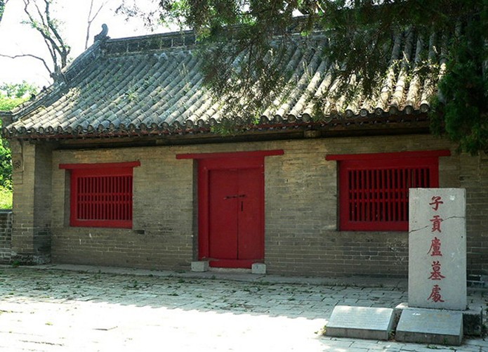 孔子墓西的3間西屋為子貢廬墓處。孔子死后,眾弟子守墓3年,相訣而去,獨子貢在此又守3年。后人為紀(jì)念此事,建屋3間,立碑一座,題為“子貢廬墓處。”享殿之后,另有一座灰瓦攢尖頂?shù)姆酵ぃQ“楷亭”。亭內(nèi)石碑上刻著一棵古老的楷樹,即摹自其南側(cè)的“子貢手植楷”。相傳子貢奔喪來后,將一棵楷樹苗栽于其師墓旁,后成大樹。清康熙間遭雷火焚死,后人將枯干圖象刻于石上。