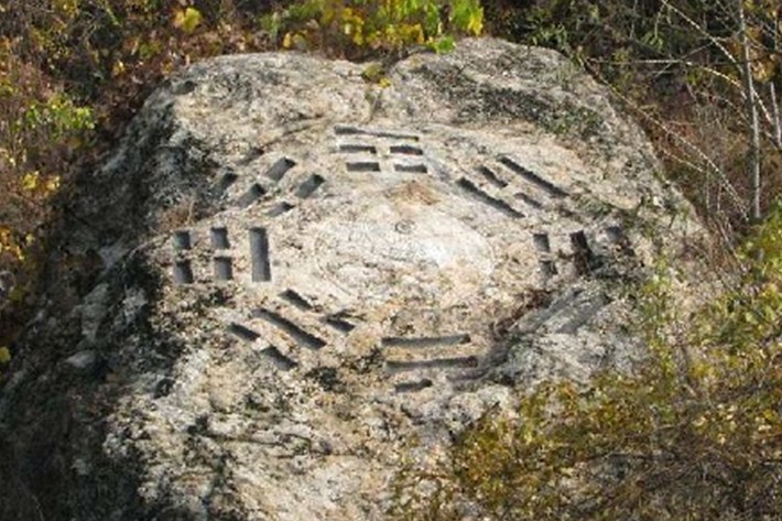 與石花頂隔溝對(duì)峙,山城有古城遺跡。現(xiàn)存有人工鑿刻的石椅、石旗桿、定向盤等。石椅坐南朝北,下臨深淵,兩側(cè)有平臺(tái),近處三個(gè)山峰上各有一小石椅。