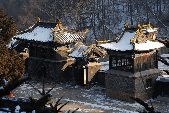 天地樓建在念佛堂前崖下,與牌坊相對(duì),歇山式,磚木結(jié)構(gòu),面闊三間,正脊兩端有吻,斜脊磚雕跑獸。檐下有柱頭,補(bǔ)間五鋪?zhàn)鞫饭埃┎世L。底部是一個(gè)券門,門楣上磚雕二龍戲珠。券門外橫書“山門鎮(zhèn)靜”四個(gè)字。樓兩側(cè)各有一個(gè)角門。念佛堂是依而建,硬山式、磚木結(jié)構(gòu)。面闊五間,前有回廊。另修配房五間。