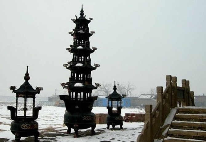 原四寺都有殿堂,據(jù)《盛京通志》卷九十七記載:永光寺原有大殿五楹,碑亭二座、天王殿三楹、鐘鼓樓二座、山門三楹。寺東寶塔一座,禪堂僧房二十四間。延壽寺原有大殿五楹、經(jīng)堂三楹、碑亭二座、天王殿三楹、鐘鼓樓二座、寺西寶塔一座、山門三楹、晾經(jīng)樓一楹、禪堂僧房三十間。廣慈寺原有大殿五楹、碑亭二座、天王殿三楹,鐘鼓樓二座、寺南塔一座、山門三楹……。現(xiàn)在四寺的殿堂,除法輪寺保留大殿五楹,天王殿三楹,東西配殿各五楹,寺北寶塔一座,山門三楹外,其它各寺的建筑均已無存。四塔的建造形式,均為藏式喇嘛塔,是由基座、塔身、相輪三部分構(gòu)成。基座為方形束腰須彌座,有上下框,在四角和每面中間立有兩根石柱,從而每面構(gòu)成三個壸門。石柱上都雕有寶相花、西蕃蓮等紋飾。每面中間壸門置磚雕寶盆和火焰,左右壸門都有高大凸起的磚雕雄獅。基座上框之上又起三層磚砌圓壇座。上面即是寶瓶式塔身塔身的南面辟有佛龕內(nèi)供神牌,佛龕周圍嵌流麗的云珠。塔身之上為十三層相輪,再上為塔剎,版權(quán)所有山東聊城聊之旅國際旅行社有限公司,轉(zhuǎn)載必究!由銅鑄仰伏寶蓋、日、月、寶珠組成。寶蓋之下懸風(fēng)鐸。西塔因年久失修,已殘破不堪,于1968年拆除。西塔塔身內(nèi)出有五谷、松柏樹枝、香泥小塔、金銀塊和金珠、琥珀珠、瑪瑙珠、寶石珠等,還有多種文字的經(jīng)卷。在地宮中出土了銅質(zhì)鎏金天地佛(系密宗大威德金剛),天佛是一頭四面,頭戴王冠,頭上還有一立佛,十二只手臂,手中握有降魔杵,捆仙索,照妖鏡等法器。地佛與天佛相擁,手中也握有法器。天地佛身下懸有許多人頭,腳下踩著一仰一伏的兩個魔身。地宮中還出有塔式小銀盒,盒內(nèi)裝一小葫蘆,玉匜。在一景泰蘭盤內(nèi)裝有琥珀珠、碧璽珠、藍色料珠、綠松石,紅寶石、藍寶石,孔雀石,是為七寶,還有果品等。當(dāng)為天地佛供養(yǎng)之物。