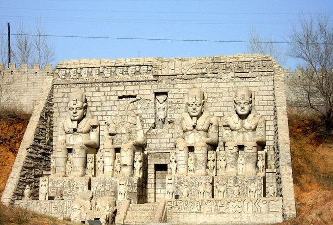 在埃及尼羅河西岸的峭壁上,雕鑿著四尊巨大的坐像,這四尊坐像均是古埃及第19王朝法老拉美西斯二世的雕像,每尊坐像高20米,其中一尊在戰(zhàn)爭中遭到破壞。門口上端雕刻的立像是太陽神,這是炫耀法老巨大權(quán)力的紀(jì)念性雕刻,臉部屬于肖像雕刻,具有寫實的特點。在尼羅河上航行可以看到這些巨人,并給人留下法老具有強大威力的難忘印象。坐像下面那些較小的雕像是法老的皇族。它建于公元前1275年。