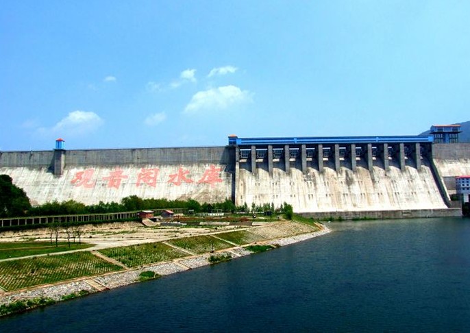 觀音閣水庫(kù)是一座以防洪、供水為主,兼有灌溉、發(fā)電、養(yǎng)魚(yú)等綜合利用的大型水利樞紐工程。主體工程1990年5月開(kāi)工,1994年落閘蓄水,2000年11月竣工。工程總投資23.19億元。控制流域面積2795平方千米 。工程為Ⅰ等工程,主要建筑物為1級(jí)建筑物,按千年一遇洪水設(shè)計(jì),萬(wàn)年一遇洪水校核,總庫(kù)容21.68億立方米。攔河壩為碾壓混凝土重力壩,共分65個(gè)壩段,由攔河壩段、溢流壩段、底孔壩段和電站壩段組成,最大壩高82 米,壩頂長(zhǎng)1040 米,寬10 米。