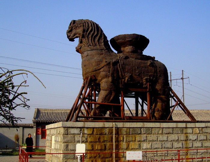 河北滄州鐵獅子鑄于后周廣順三年(公元953年),距今已有一千多年的歷史,采用“泥范明澆法”鑄成,具有較高的歷史科學和藝術(shù)價值,為全國重點文物保護單位。通寬5.35米,身長6.30米,身高6.6米,體寬3.0米,重約40噸,素有“獅子王”的美譽,一千多年來,它飽經(jīng)滄桑,在古滄州,它曾被當成神物供奉,享盡了香火;在烽火連天、哀鴻遍野的戰(zhàn)亂年代,又經(jīng)受了刀戈的砍殺,在獅體內(nèi)外斑痕累累。