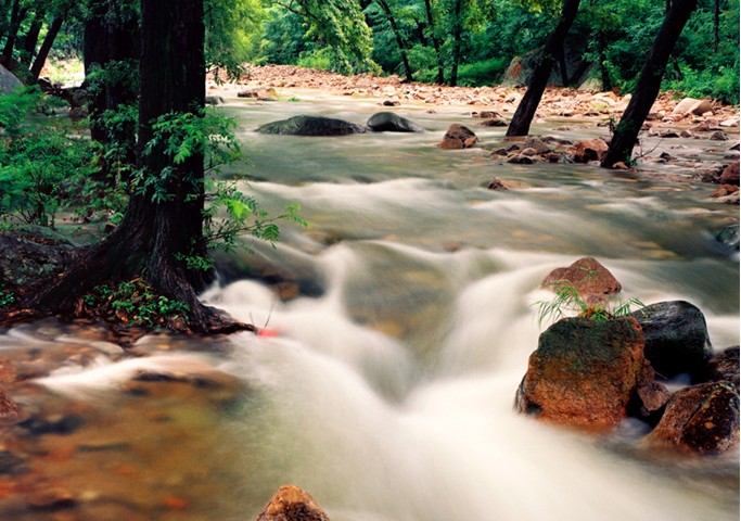 北九水以其麗山秀水繪就的優(yōu)美畫廊,馳名中外。嶗頂源泉之水從海拔1100多 米的高峰順勢(shì)而下,中途又匯集了眾多的溪流,凌空瀉入靛缸灣,又從靛缸灣溢出,沿著長(zhǎng)長(zhǎng)的深山峽谷,彎彎曲曲,時(shí)急時(shí)緩,時(shí)聚時(shí)散,奔騰而下。這樣一來,再配以兩側(cè)群峰聳峙,禽鳥啼鳴,奇光薈萃,綠樹成蔭,山與水相互纏繞,形成了一步一景、一灣一色的瑰麗畫廊風(fēng)光。