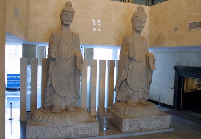 在青島歷史文化博物館的正門大廳內(nèi),矗立著兩尊北魏(公元500—550年)時(shí)期的石佛像,距今已有1500余年的歷史。佛像身高一丈八尺,重約30噸,俗稱“丈八佛”。頭部雕高肉髻,面部瘦削清秀,深目高鼻,眉間有白毫相,其神態(tài)祥和、超然。長頸,內(nèi)著僧祗支,胸前束僧祗支帶,外披褒衣博帶式長衣,衣紋雕刻成“v”形斷面。雙手施無畏與愿印。跣足立于蓮花座上,蓮座下雕四方形的須彌座。石佛像造型優(yōu)美,雕刻技法嫻熟,衣紋細(xì)致柔和,神態(tài)栩栩如生。充分表現(xiàn)出北魏孝文帝漢化政策的施行,反映到佛教雕塑藝術(shù)上的風(fēng)格特點(diǎn)。兩尊石佛像最早安放在山東臨淄縣龍泉寺內(nèi)。