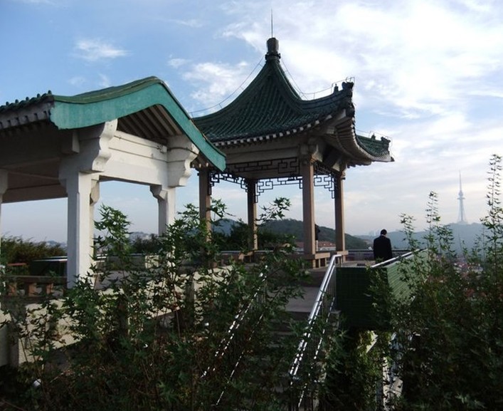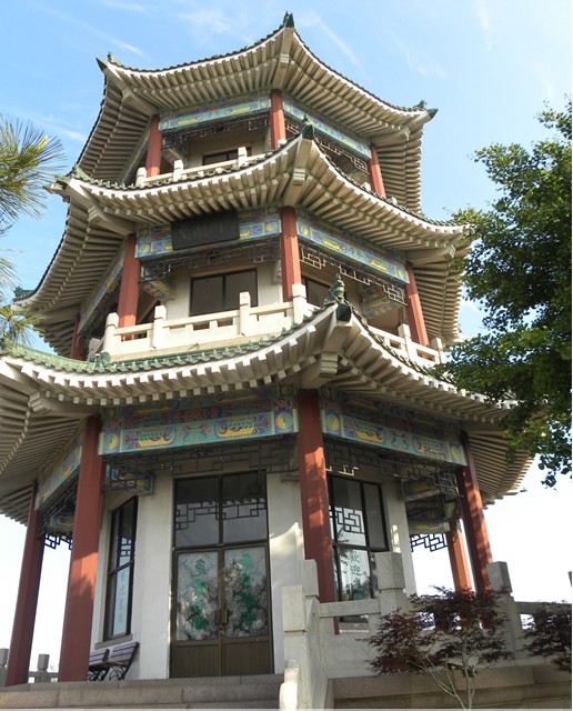 我們從小魚山的大門抬階而上,看到的這個(gè)亭子是一個(gè)挑檐式的六角亭,在亭內(nèi)可以把碧波蕩漾的匯泉灣一覽無余,故得名“碧波亭”。“碧波亭”的匾額“碧波”二字是由著名的國畫藝術(shù)大師吳作人手書的。大家看遠(yuǎn)處的山上有三棟紅色蘑菇樓宛如三柄熊熊燃燒的火炬,那是青島市十大山頭公園之一的信號山公園。在半山腰綠樹叢中的那棟別具特色的建筑是青島市迎賓館,原是“德國總督府官邸”。我們再由“碧波亭”拾階而上,站護(hù)欄邊可以看到右下邊有兩幢民族式建筑,一座形如城樓,一座貌似宮殿,那就是青島市海產(chǎn)博物館。