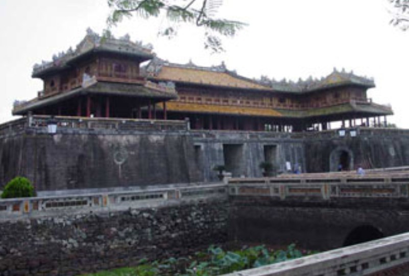 越南順化故宮正門。規(guī)模比中國(guó)北京故宮的午門小,但其式樣基本一樣。平面呈冂形,下有高大的磚石墩臺(tái),臺(tái)正面圍以垛墻。墩臺(tái)有5門,正中門高5.32米,寬3.28米,門正中上方有“午門”兩個(gè)大字。當(dāng)初字外包金,1943年12月10日包金被竊。墩臺(tái)上建樓5座,名五鳳樓,樓分兩層,氣勢(shì)巍峨。下層正中是“御座”。上層為各宮人觀禮之所。當(dāng)時(shí),午門只在慶典節(jié)日開(kāi)放。午門也是阮氏王朝被埋葬的見(jiàn)證,1945年8月30日阮朝末代皇帝被迫在此正式宣布遜位,并把金印和寶劍交給越南臨時(shí)政府代表團(tuán)。午門建于阮朝明命十四年(公元1833年),啟定三年(1921年)重修。抗戰(zhàn)期間遭炮火破壞,現(xiàn)已修復(fù)。以前,阮朝嘉隆初年曾在午門現(xiàn)址建有南闕臺(tái)。