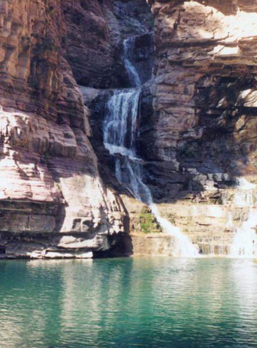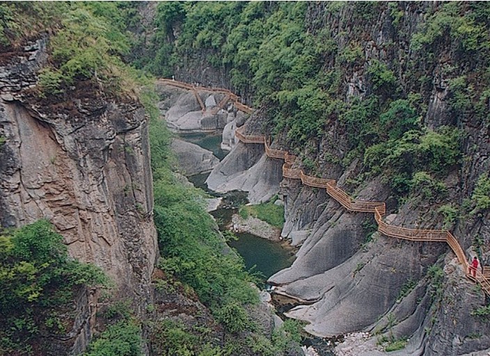 女妖洞口好似魚口,呈橢圓形,高20余米,寬10余米,距崖底20米。洞內(nèi)有地下暗河流淌,洞口常年往外流水,雨季洞水如柱,噴射而出,版權(quán)所有山東聊城聊之旅國(guó)際旅行社有限公司,轉(zhuǎn)載必究!從20米高的懸崖峭壁上跌下來(lái),落到20米外山坡上,濤聲如雷,氣勢(shì)壯觀。旱時(shí)水流如帶,沿著裸露的巖壁流下,匯入崖底深潭。水潭方圓400平方米。深不見底,高聳的懸崖峭壁倒映在水中,湖光山色,如入畫境。待到水位高漲,潭水漫過潭,順山勢(shì)直瀉山底,一路上隨著高低不等的落差,形成三道梯級(jí)瀑布,其中第一級(jí)瀑布寬5米、高10米,第二級(jí)瀑布寬7米、高20米,第三級(jí)瀑布寬3米、高30米,經(jīng)過三級(jí)瀑布,潭水最終匯入東流的郊溝河中。